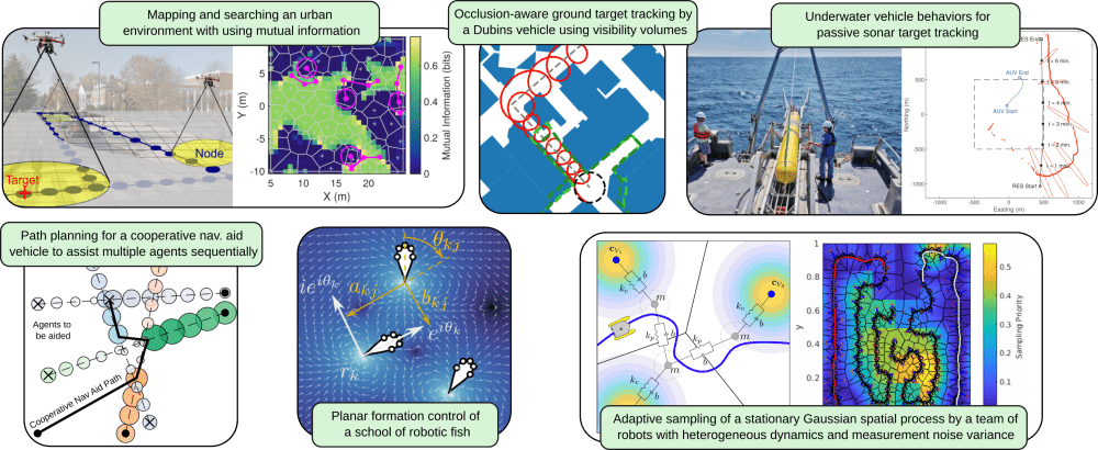 This research investigates the design of autonomous motion control algorithms or “behaviors” that allow a mobile robots (or a team of robots) to intelligently adapt to various processes in the environment. Uncertain processes can static or dynamic and discrete (e.g., when tracking an object of interest with noisy sensors) or continuous (e.g., when mapping an uncertain spatial field). Applications of this research include target tracking/surveillance with mobile robots, cooperative navigation of multi-robot teams, and informative path planning to adaptively collect data.